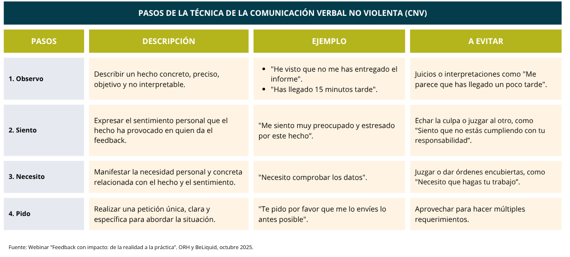 Esta técnica, desarrollada por Marshall Rosenberg, destaca por permitir convertir la retroalimentación en un diálogo constructivo y, para ello, propone cuatro pasos secuenciales que necesitan ser interiorizados a través de la práctica para que la comunicación fluya de manera natural: