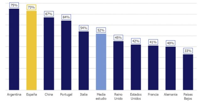 Randstad destaca que el 56 % de los españoles temen perder su empleo, el porcentaje más alto de Europa (73 %), 19 puntos porcentuales por encima de la media del estudio (37 %) en su análisis sobre los datos de la última oleada del estudio Randstad Workmonitor, elaborada a partir de más de 13.500 encuestas a profesionales ocupados de 33 países. De hecho, solo los trabajadores de India (70 %), México (61 %) Argentina y Brasil (ambos con el 60 %) tienen un mayor miedo a perder su trabajo que nuestro país. Países de nuestro entorno como Italia (34 %), Reino Unido (28 %) o Francia (24 %) se encuentran bastante por debajo.