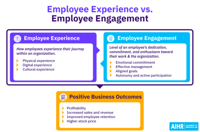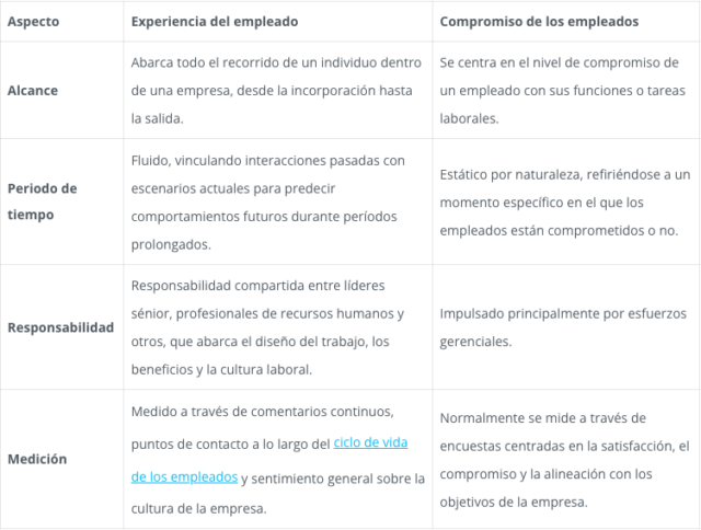 Ambos conceptos están estrechamente relacionados en una dinámica que se retroalimenta: “El compromiso de los empleados es el resultado de su experiencia. Sin embargo, los empleados comprometidos contribuyen a crear un entorno de trabajo positivo, lo que, a su vez, ayuda a mejorar la experiencia del empleado para todos”.