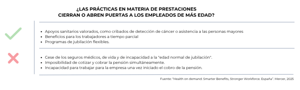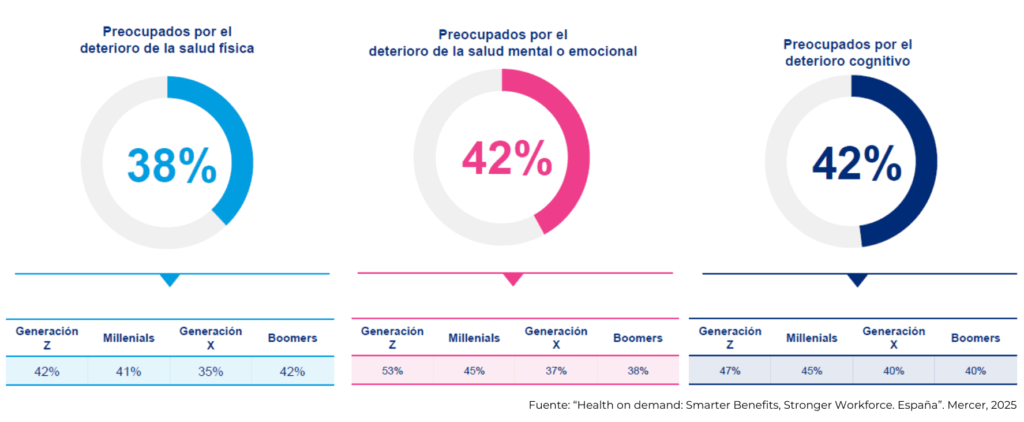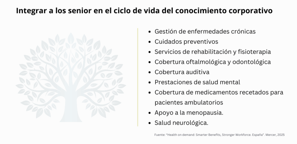 Centrándonos en el apartado del bienestar, parece evidente la necesidad de que los programas corporativos incluyan y segmenten específicamente las prestaciones dirigidas al colectivo senior. Y no sólo en materia de planificación financiera o de apoyo emocional a la desvinculación, sino en las cuestiones que realmente lanzan el mensaje al que las cifras obligan: el cuidado de la salud más allá de los 65, incluida la adaptación física del puesto de trabajo y la consideración de las cuestiones cognitivas en el desempeño de las funciones. El informe de Mercer “Health on demand 2025”, en su apartado para España, destaca que entre las principales preocupaciones de los empleados en nuestro país están el deterioro de la salud física, mental y cognitiva, ésta última incluso destacada por la Gen Z.