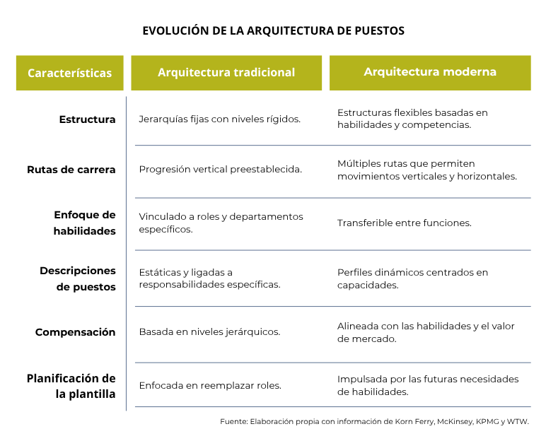 El informe de Korn Ferry “Designing a future-ready job architecture frame”, recoge cómo las empresas están migrando de las jerarquías rígidas y tradicionales hacia marcos más flexibles y modernos, centrándose en las habilidades y competencias para adaptarse mejor a la era de la agilidad.