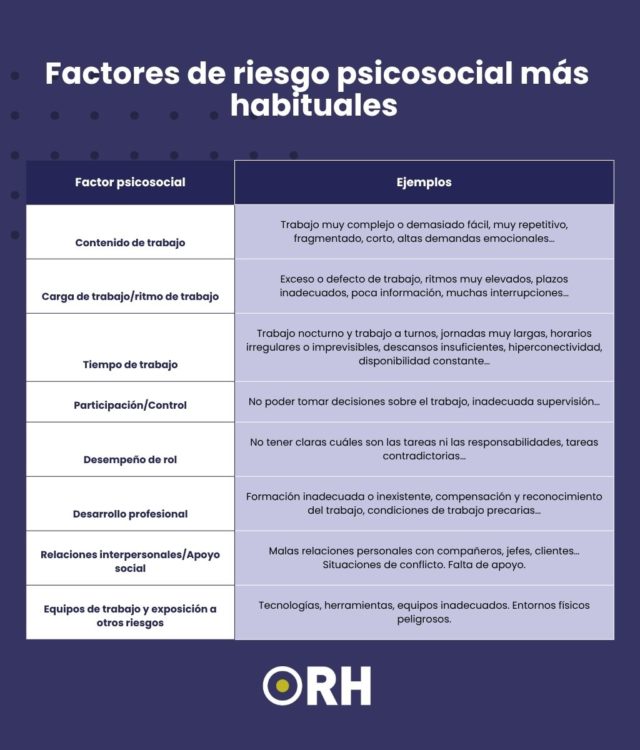 Los factores de riesgo psicosocial forman parte del trabajo -son condiciones de trabajo- y son aspectos relacionados con cómo está organizado, con el contenido del puesto de trabajo y las tareas que conlleva y con las relaciones entre las personas. Algunos de los factores de riesgo psicosocial más habituales se pueden consultar en el siguiente listado basado en el Marco Europeo para la Gestión del Riesgo Psicosocial.