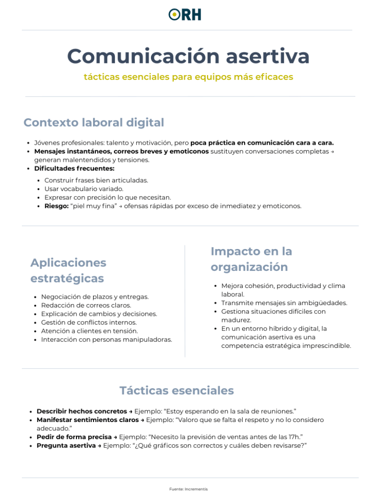 Según David Comí, director y formador de Incrementis, el 60% de los programas de formación corporativa en habilidades ya sitúan la comunicación asertiva como una competencia clave para transmitir mensajes claros, directos y respetuosos, incluso en situaciones difíciles.