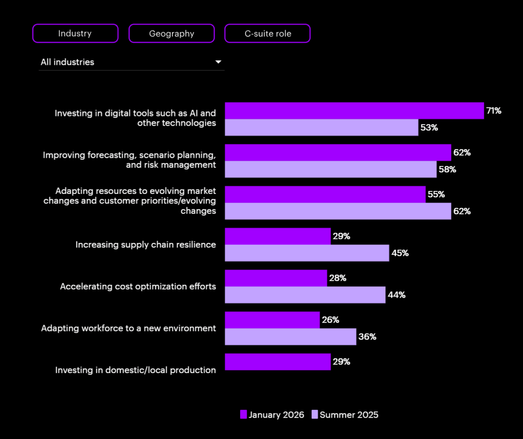 - La adopción de la IA se acelera a medida que los directivos predicen un crecimiento más sólido de los ingresos. El 78% de las empresas piensa aumentar la inversión en IA en 2026.